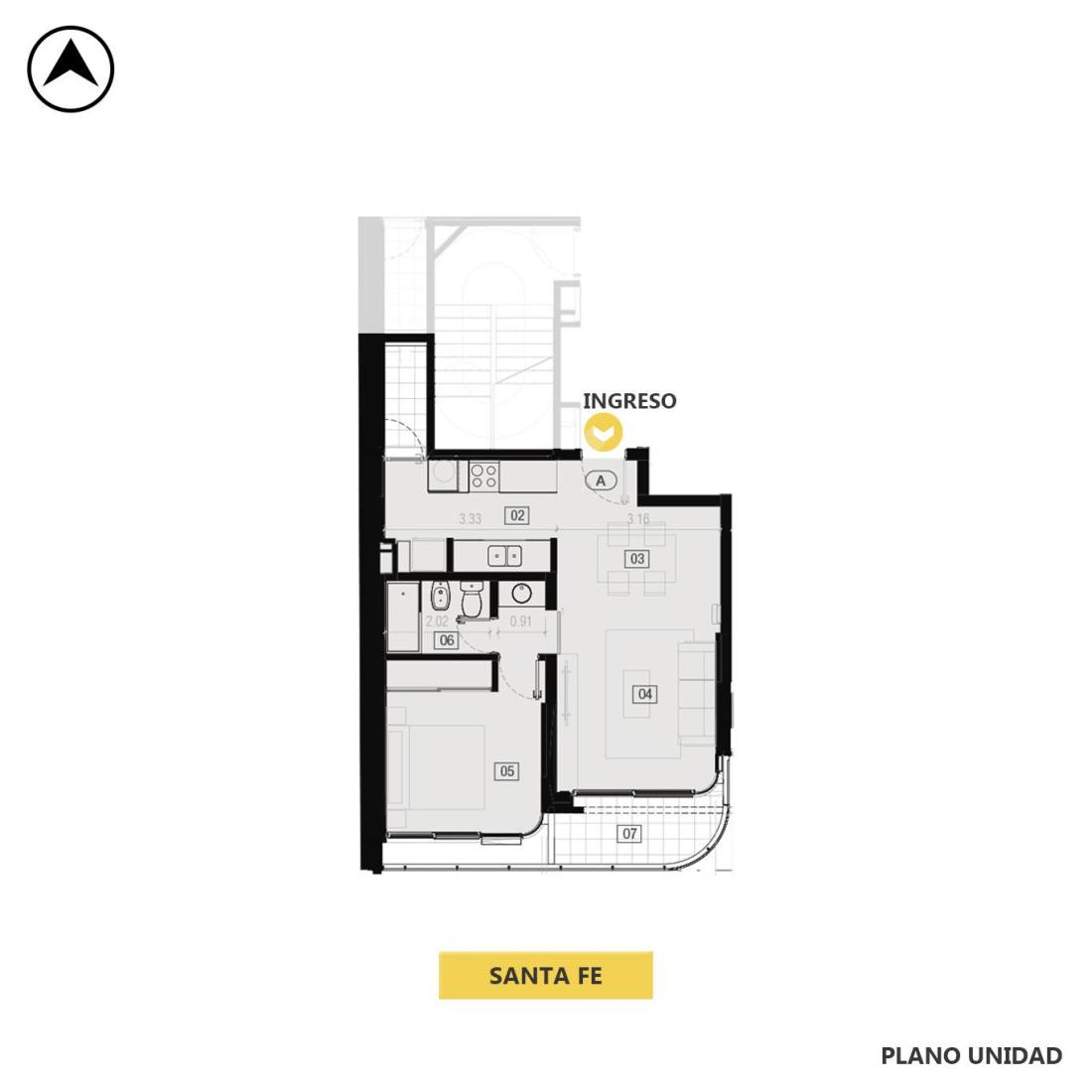 Amplio living comedor con balcón corrido al frente. Cocina semi separada con ventilación al contra frente. Habitación al voladizo asistida por baño completo.
