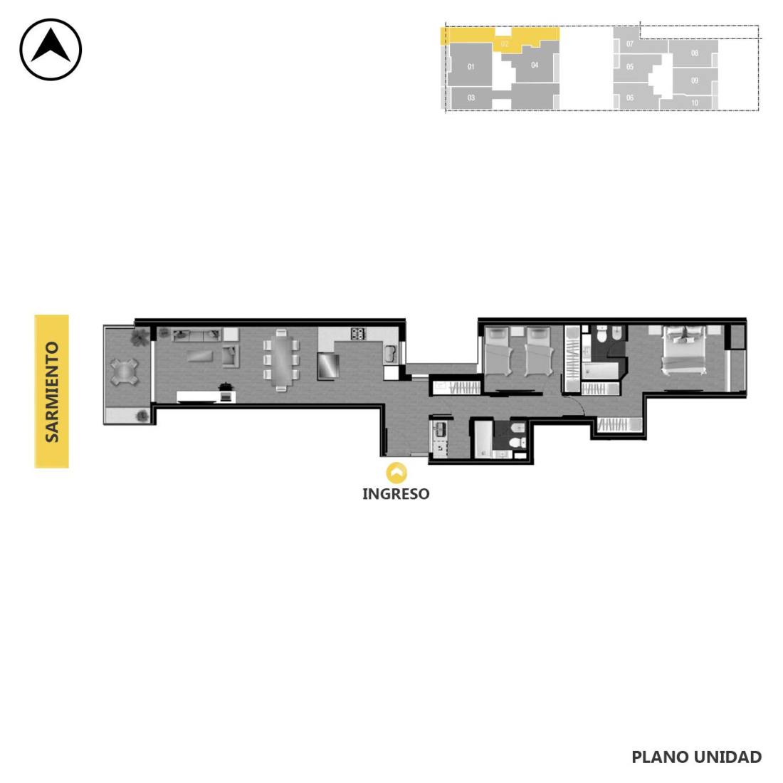 El edificio Sarmiento 1500 se ubica en una zona céntrica de Rosario, cerca de icónicos puntos como el Monumento a la Bandera, la Estación Fluvial y el Instituto Politécnico General San Martín. Esta localización brinda a sus residentes acceso rápido a una amplia oferta comercial, centros educativos, servicios de salud y áreas de esparcimiento, ideales para un estilo de vida urbano. Con fácil acceso al transporte público y avenidas principales, el desarrollo permite una conectividad inigualable. La edificación está compuesta por unidades de 2, 3 y 4 ambientes con terminaciones de alta calidad y cuenta con cocheras distribuidas en dos niveles. El edificio integra áreas comunes de primer nivel y medidas de seguridad avanzadas para maximizar la comodidad y tranquilidad de sus residentes.